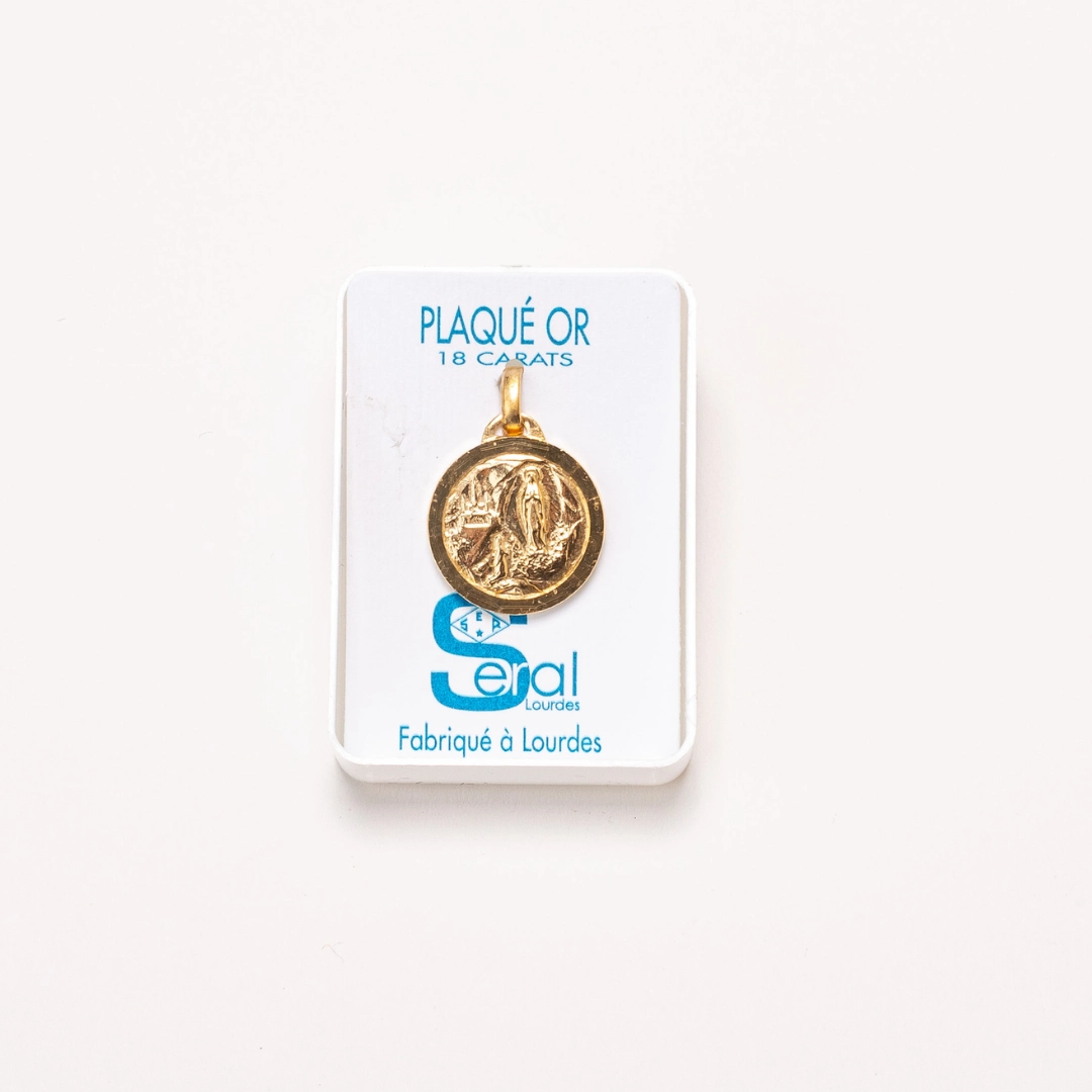 Cette médaille est en plaqué or 18 carats. Elle représente l’Apparition de la Vierge à Bernadette. Au dos de la médaille est représenté le visage de la Vierge.